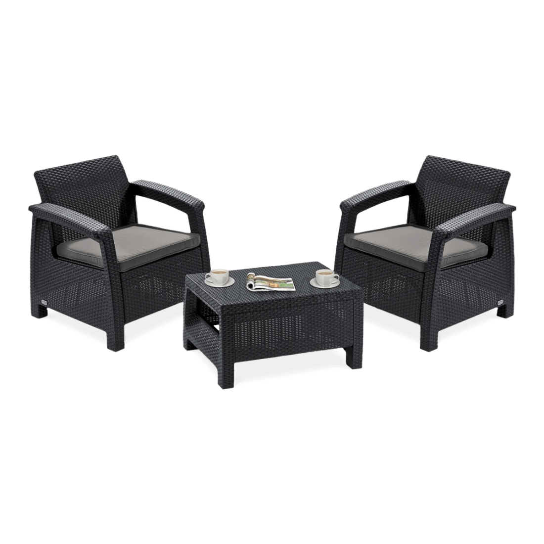 The CORFU WEEKEND Graphite set consists of two armchairs and a table made of high-quality polypropylene with a technorattan look. This material guarantees resistance to weather conditions and UV radiation, ensuring long-lasting colour retention. The furniture is designed with comfort in mind, with high backrests and cushions equipped with zip fasteners for easy maintenance.
