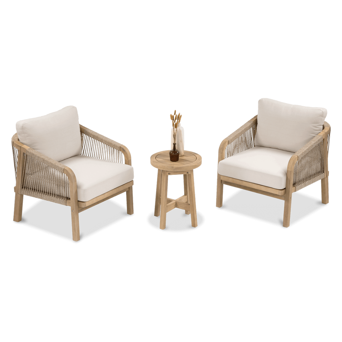 The Marigold 2+1 Caffe balcony set includes two armchairs and a coffee table, made of FSC-certified acacia wood. Solid workmanship and woven nylon rope backrests ensure durability and comfort in various weather conditions.