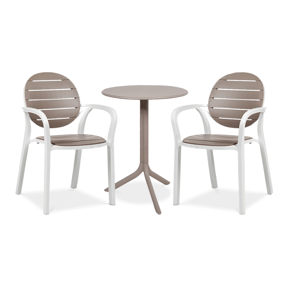 The Nardi product consists of two chairs and a table, using glass fibre reinforced polypropylene for durability and weather resistance. The chairs are easy to stack, and the table offers two height options, allowing it to be adapted to the specific needs of the user.