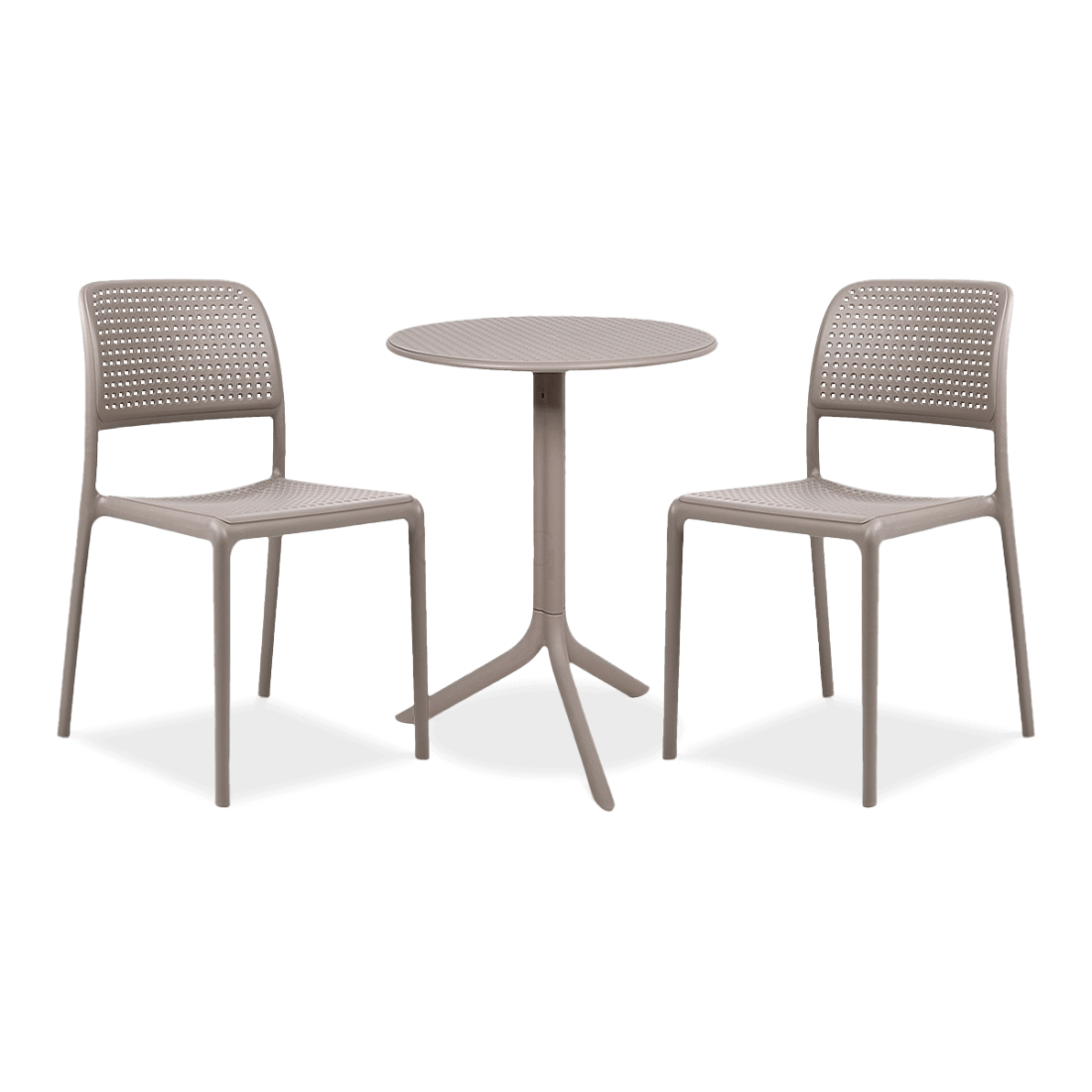The Nardi BORA BISTROT/STEP 2+1 Tortora garden furniture set combines functionality and durability thanks to the use of glass fibre reinforced polypropylene. The chairs are stackable and the table offers two height options, allowing it to easily adapt to a variety of interiors and outdoor dining areas.