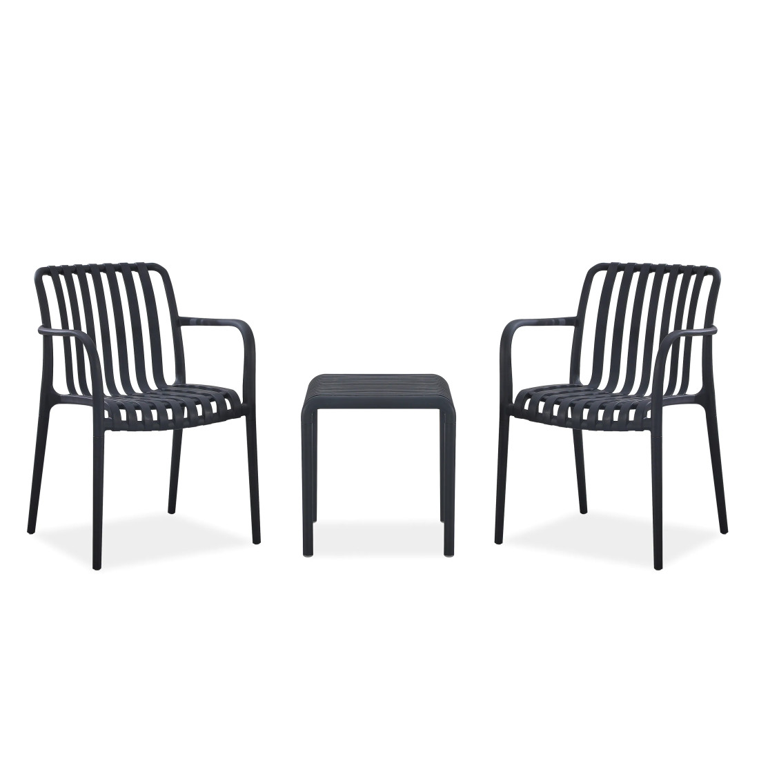The RONA 2+1 garden furniture set meets the needs of professional users, combining elegant design with durability. It consists of two chairs and a table made of high-quality polypropylene with a UV filter, which protects against fading and the effects of sunlight. The stackable design of the chairs allows for easy storage and transport. The product complies with European standards, which guarantees stability and safety of use.