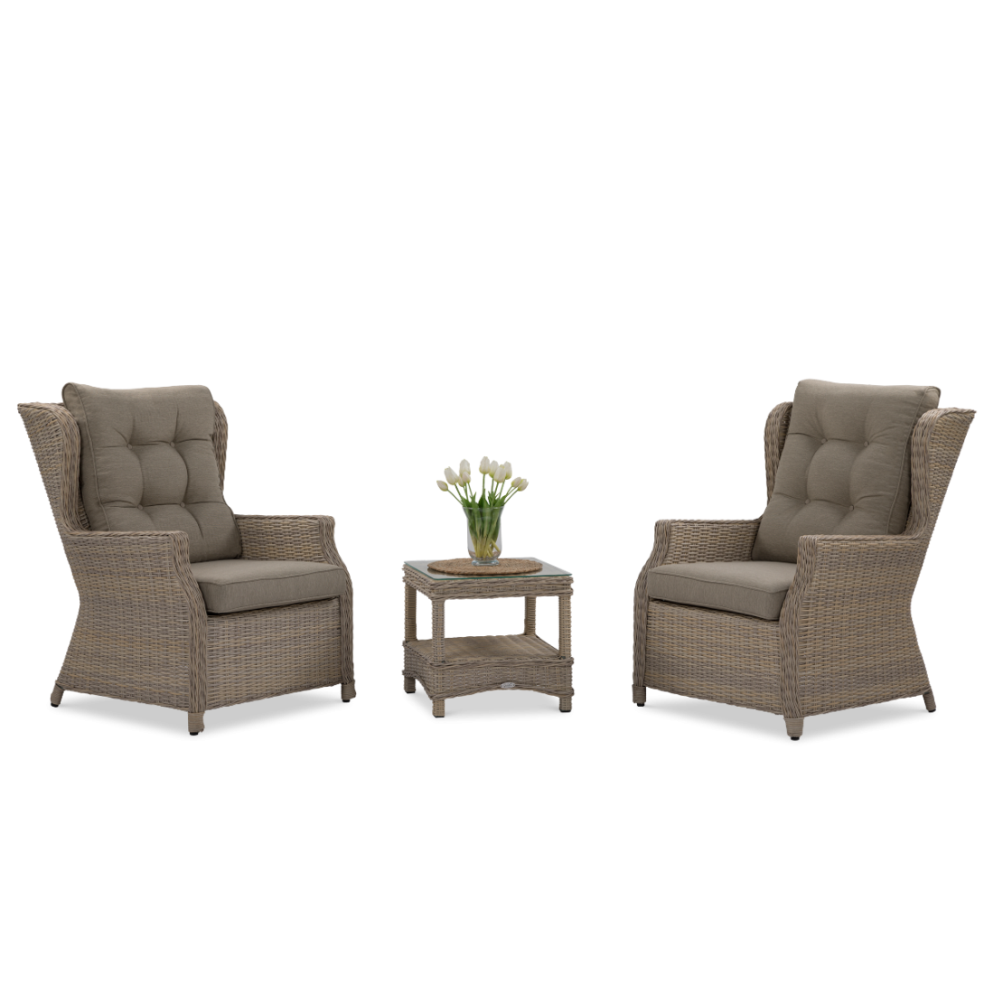 The functional Trivento Duo Beige garden set has been designed with comfort and aesthetics in mind. It consists of two ergonomic armchairs and a practical coffee table with a tempered glass top. The aluminium frame construction ensures lightness and corrosion resistance. The technorattan used to make the set is highly durable and resistant to changing weather conditions.