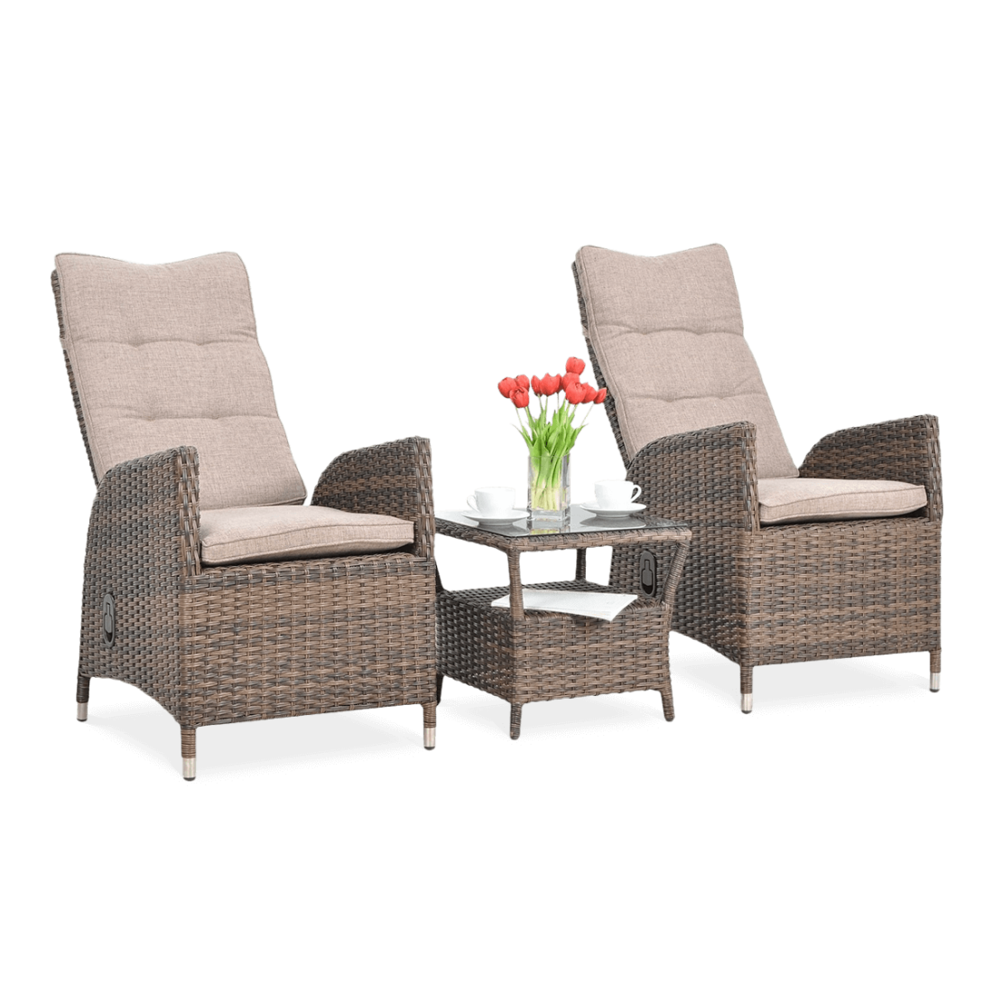 The MALTA DUO Brown lounge set is a two-piece set that is ideal for arranging outdoor and indoor spaces. The set includes two armchairs with mechanical backrest adjustment and a practical coffee table with a glass top. The steel construction guarantees the durability and stability of the furniture, which is finished with an aesthetic weave of weather-resistant technorattan.