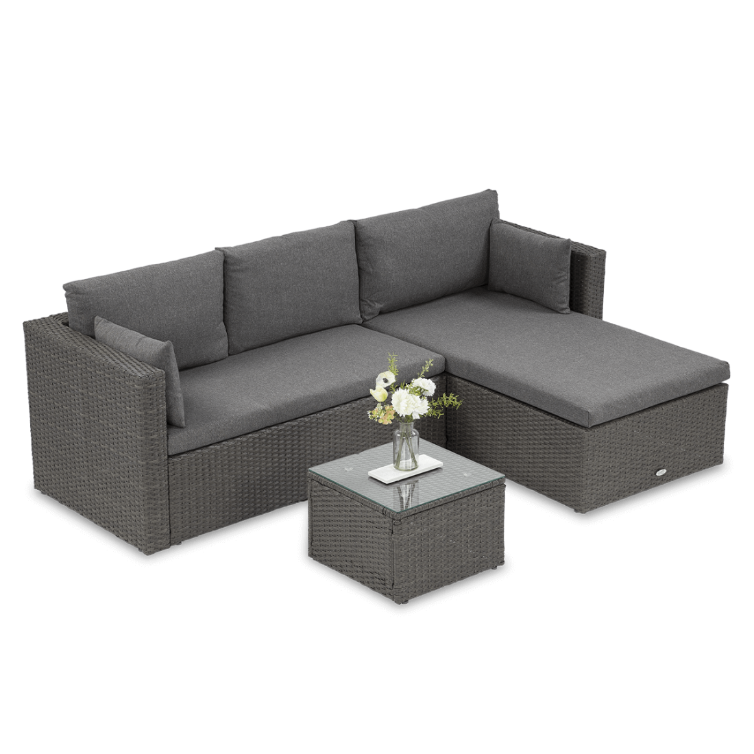 The product is distinguished by its high quality, which includes a two-seater sofa, a chaise longue and a coffee table. The steel construction ensures durability and flexible furniture arrangement. Weather-resistant technorattan wickerwork guarantees aesthetics and durability, while cushions with zip fasteners provide increased comfort.