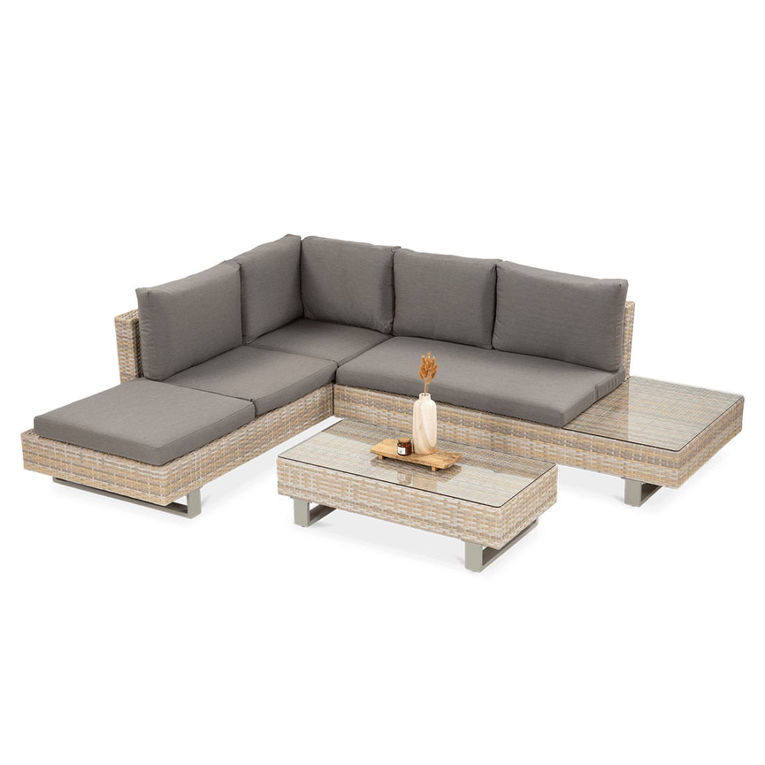 The Willis Caffe Nature garden corner sofa is a comprehensive solution for modern outdoor furniture. The structure, based on a powder-coated aluminium frame, ensures resistance to various weather conditions. The double layer of technorattan guarantees durability and UV resistance. Comfortable seat cushions, made of soft foam and polyester, covered with easy-care olefin fabrics, increase the comfort of use. The set of practical features is complemented by a hardened table top.