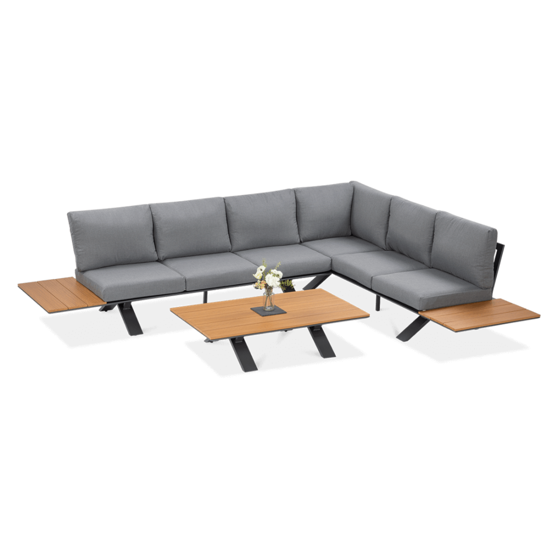 The Sorrento Wood Graphite garden corner sofa is a solution that combines functionality and high-quality workmanship. The powder-coated aluminium frame ensures resistance to weather conditions and UV radiation. The set consists of three modules: two three-seater sofas that can be arranged in a corner configuration, and a coffee table.