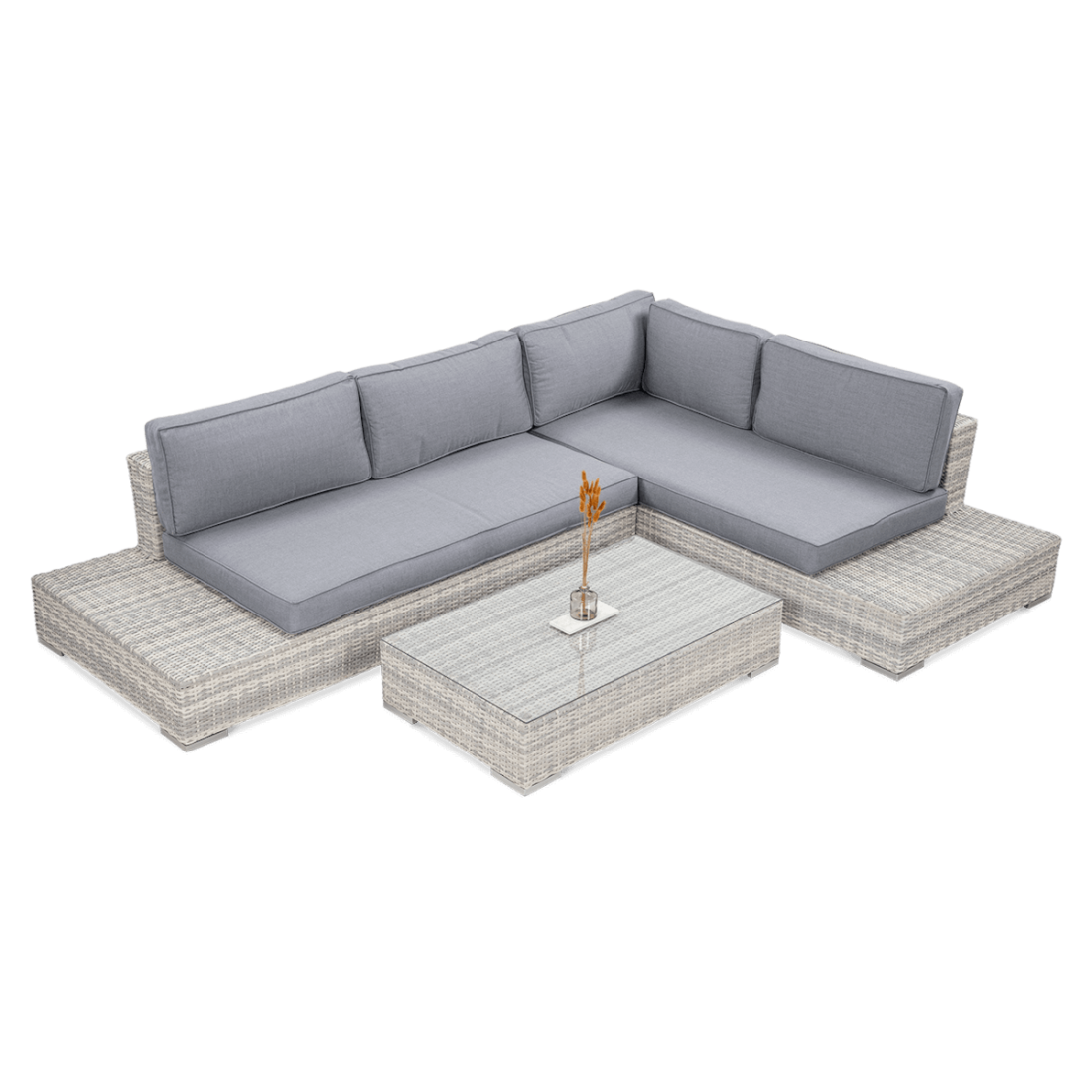 The VERONA White Grey technorattan corner sofa is a functional outdoor furniture set consisting of two main modules and a coffee table. It features a sturdy steel frame and a White Grey technorattan finish that is both durable and aesthetically pleasing. The aluminium elements and 5 mm safety tempered glass used in the coffee table complement the whole and emphasise the careful workmanship.