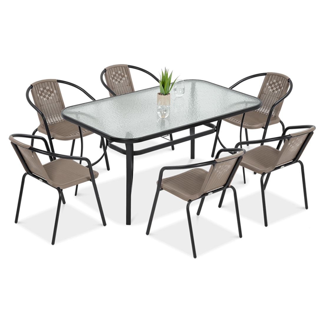 The SIMPLE 150/6 Cappuccino garden set is an elegant and practical solution designed with durability and functionality in mind. The table with an ornamental glass top and six chairs made of rattan-textured plastic are supported by a solid powder-coated steel frame. The chairs are stackable for easy storage.