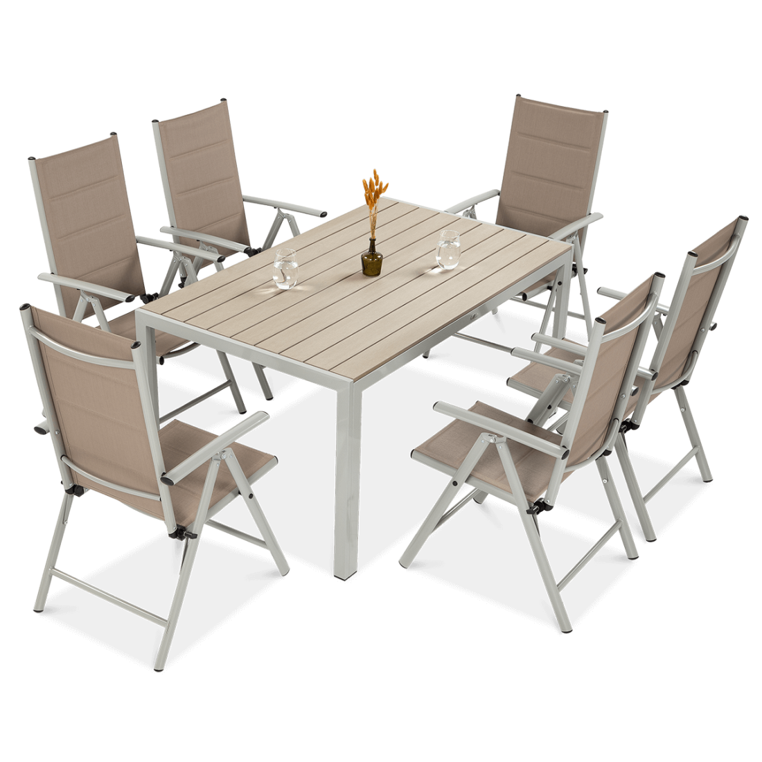The set consists of six ergonomic chairs with adjustable backrests and a spacious table. The solid, weather-resistant aluminium construction guarantees durability and strength. The table top is made of waterproof polywood composite board, which perfectly imitates wood and requires no additional maintenance.