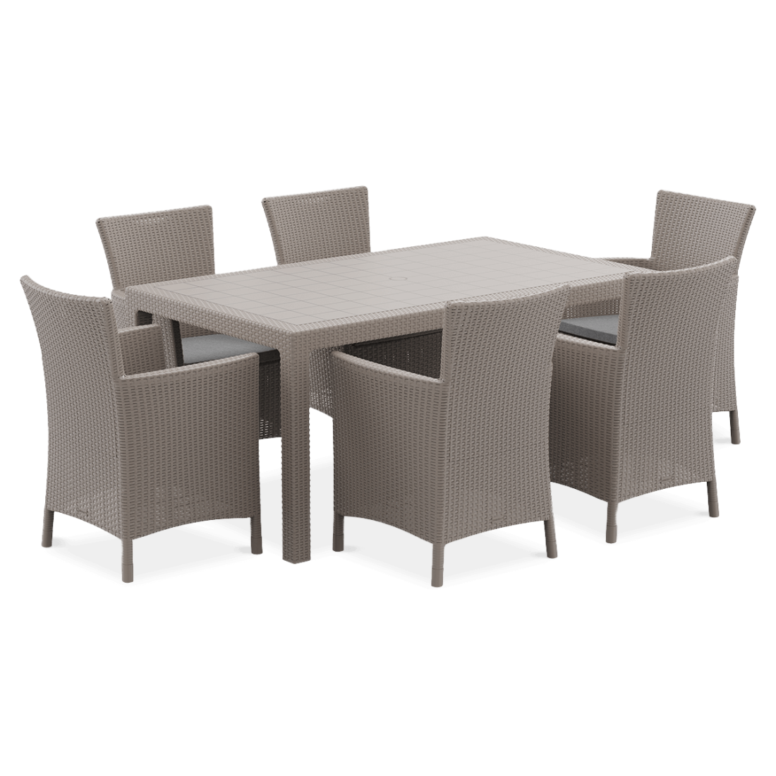 The IOWA/MELODY 6+1 Cappuccino garden set combines six ergonomic armchairs with a large rectangular table. The elements of the set are made of durable plastic imitating rattan. The material is resistant to UV radiation and changing weather conditions, ensuring long-lasting durability. The armchairs are equipped with high backrests and soft cushions with zip fasteners, which guarantees comfort of use.