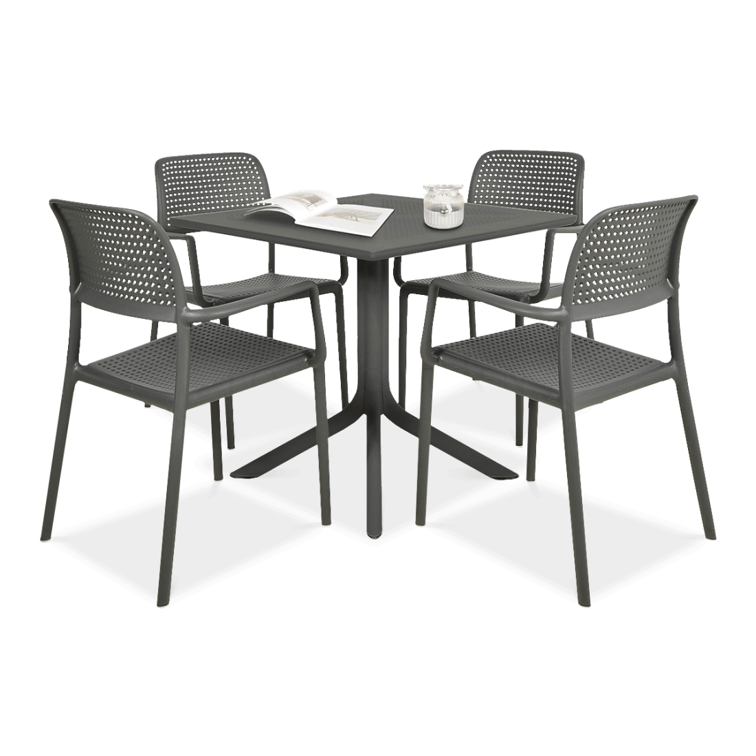 The Nardi BORA/CLIP 4+1 Anthracite furniture set is a modern solution designed for outdoor spaces. Made of durable polypropylene resin with added fibreglass, this furniture guarantees the highest quality and durability. The set consists of four ergonomic chairs and a practical table. Manufactured by the prestigious Nardi brand, they are resistant to adverse weather conditions and do not require maintenance.