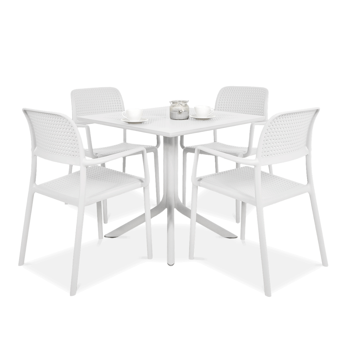 The Nardi BORA/CLIP 4+1 Bianco furniture set is the ideal choice for businesses looking for robust solutions for outdoor spaces. Made of durable glass fibre reinforced polypropylene, the furniture offers a long service life even with intensive use in changing weather conditions. The non-slip finish on the legs and the possibility of levelling the table ensure stability and safety on any surface.