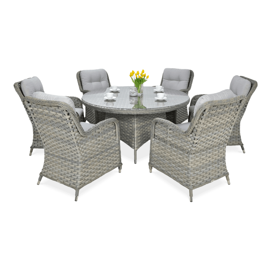 The BARCELONA Grey furniture set combines a solid aluminium structure that is resistant to corrosion with durable technorattan that is resistant to external factors. It includes six armchairs and a 140 cm diameter table covered with tempered glass, which ensures not only excellent functionality but also aesthetic appeal. The cushion covers are washable, which makes them easy to keep clean. The whole set is characterised by high stability and ease of maintenance, as well as the possibility of universal arrangement.