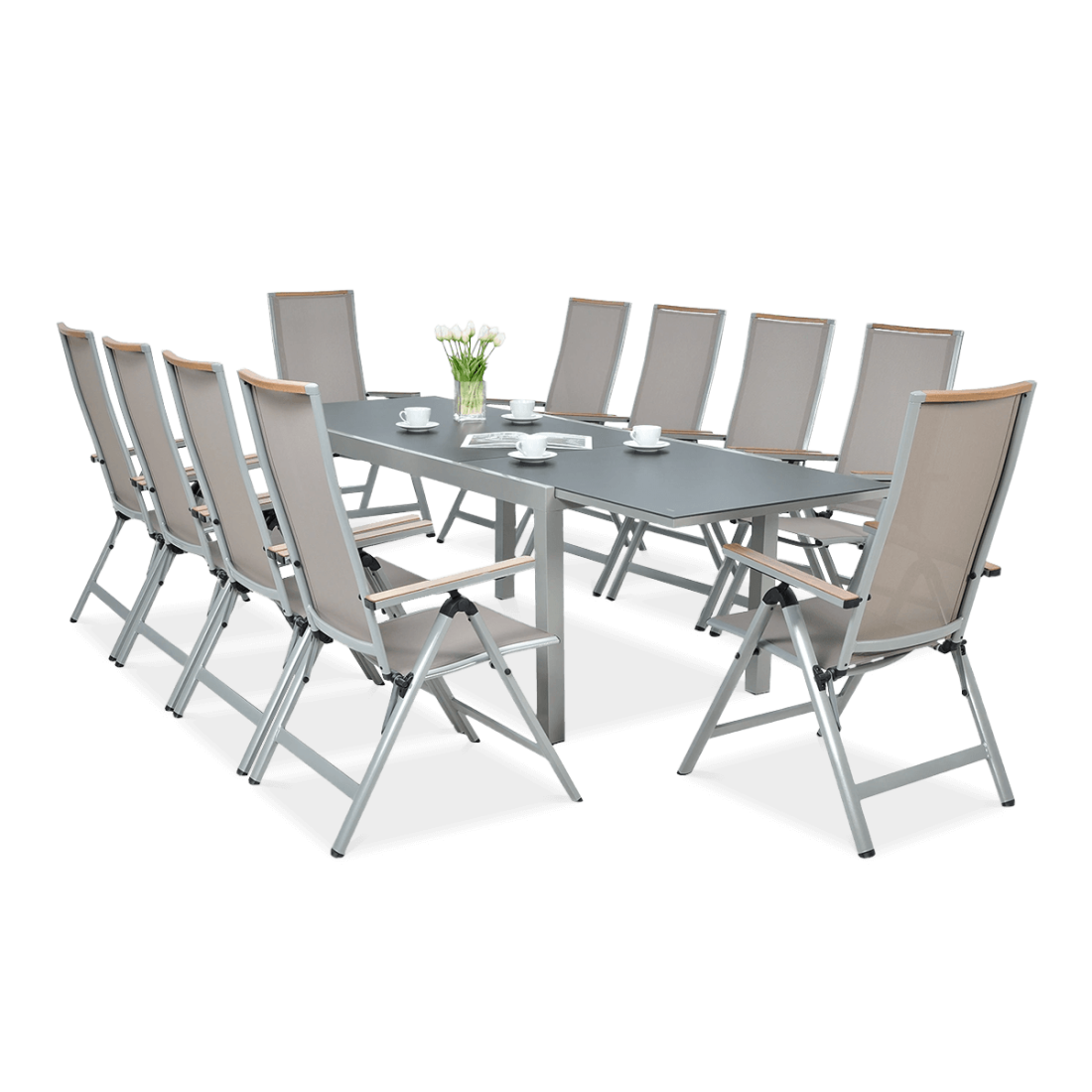 The Brisbane garden furniture set includes a large, functional table and ten folding chairs made of durable aluminium and textilene fabric. The table has an adjustable tempered glass top and flexible leg caps for stability. The chairs feature 6-position adjustable backrests and armrests with a wood-effect finish.