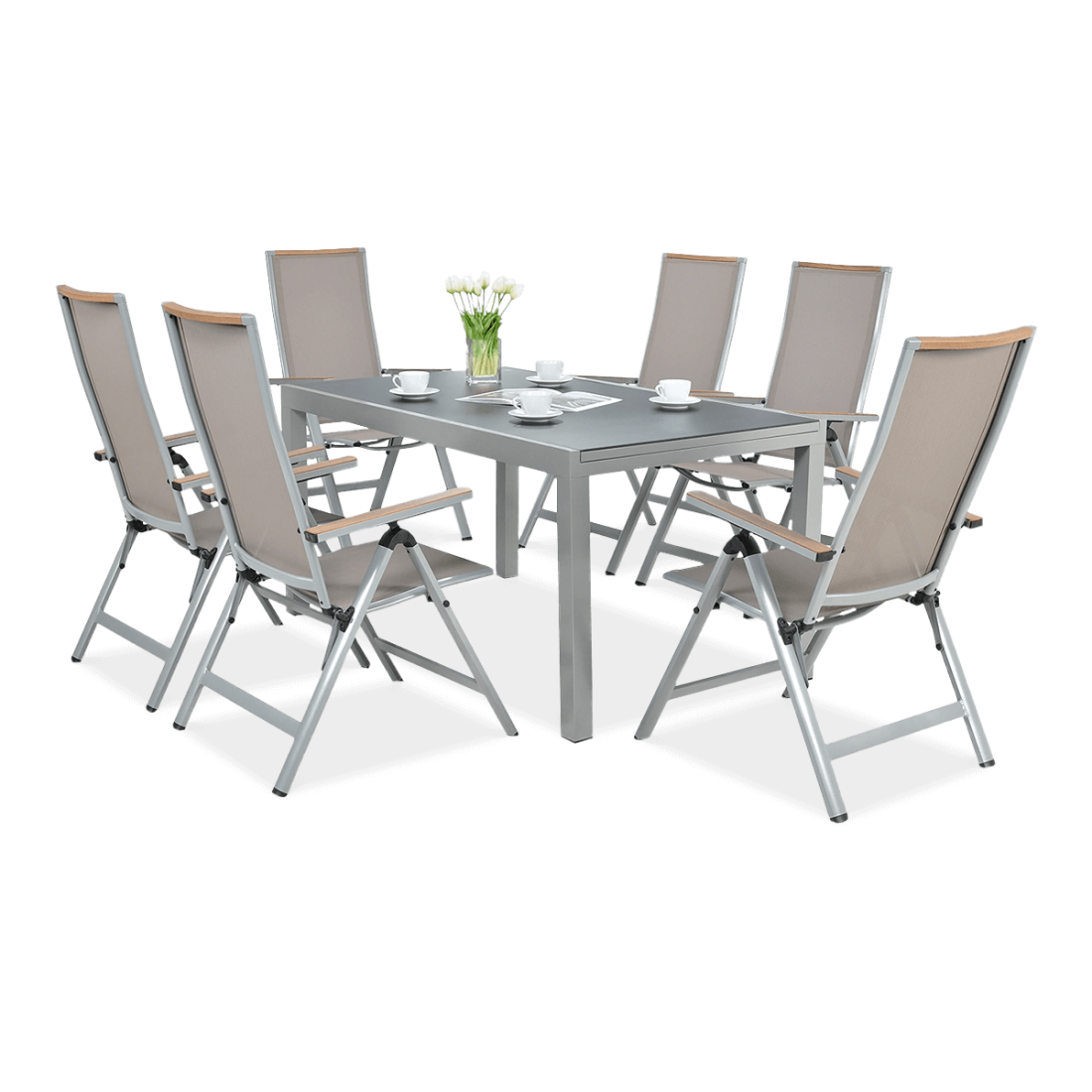 The BRISBANE 6/250 Taupe garden set includes a functional extendable table and six folding chairs. The furniture is made of powder-coated aluminium, which is resistant to corrosion and weather conditions. The chairs are equipped with durable textilene fabric for comfort during use. The table has a tempered glass top and an extension system from 150 to 250 cm. The table legs have elastomer tips for perfect levelling.