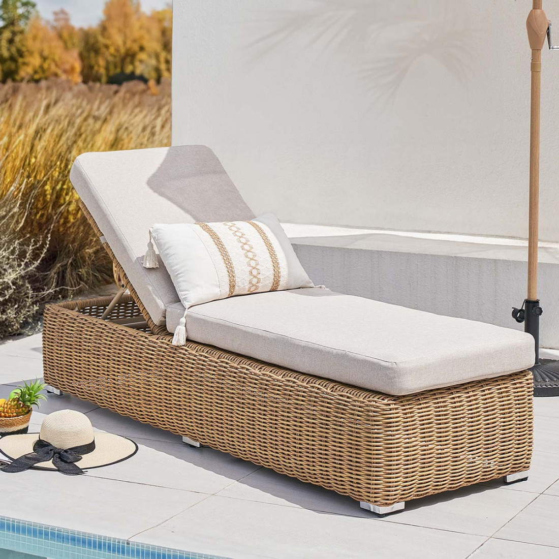 The JAKARTA Beige garden lounger has been designed with durability and comfort in mind for use in various outdoor conditions. The central element of its construction is a lightweight, corrosion-resistant aluminium frame, which ensures stability while remaining lightweight. The technorattan weave surrounding the frame is highly resistant to UV rays and moisture, allowing for long-term outdoor use. The water-resistant olefin fabric cushion provides additional comfort, and the Velcro system keeps it securely in place. The 5-step backrest adjustment allows the lounger to be adjusted to different positions, enabling relaxation fully tailored to the user's needs.