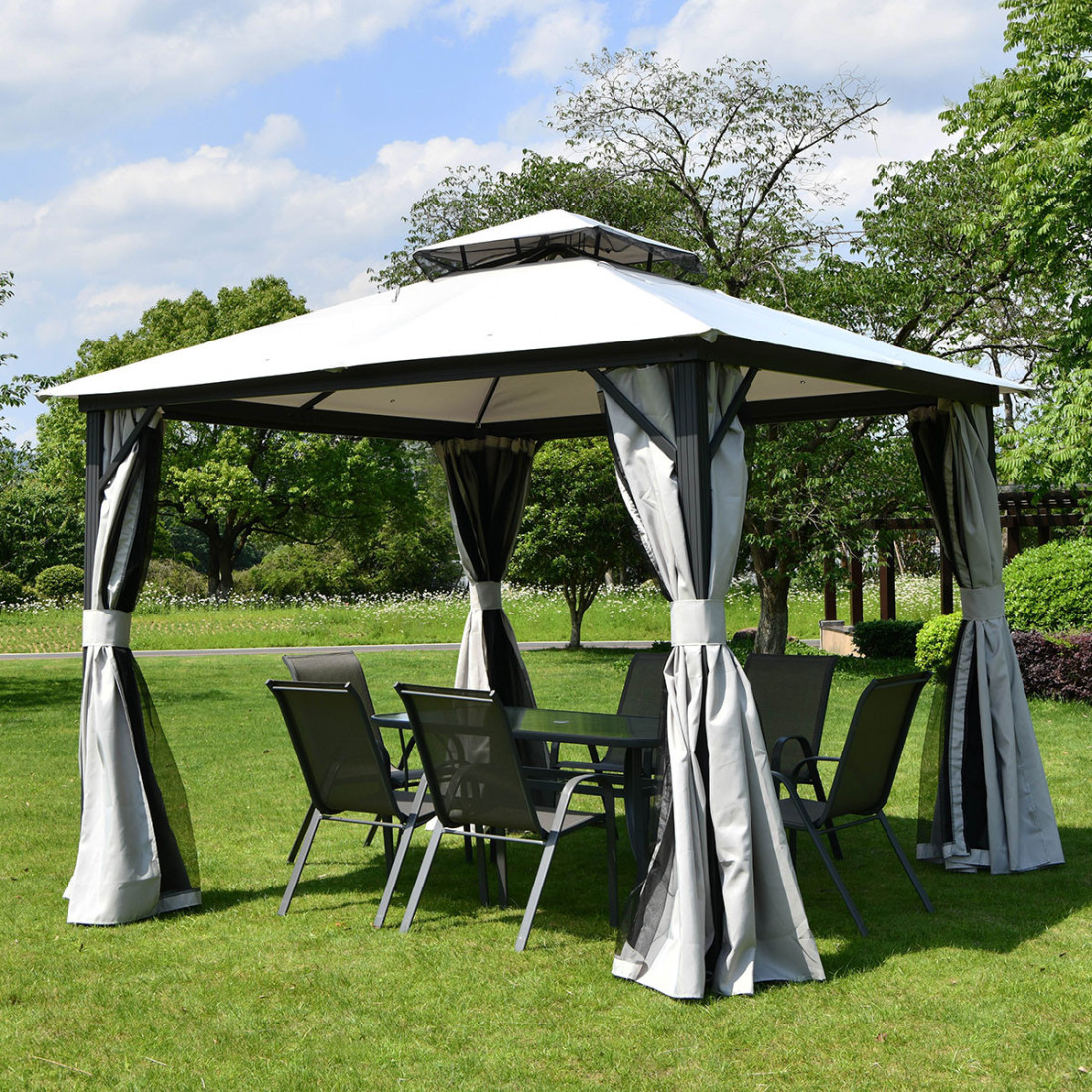 The VANCOUVER garden pavilion, measuring 3x3 metres, is a sturdy structure ideal for a variety of uses. Equipped with a powder-coated aluminium frame, it is resistant to corrosion and mechanical damage. The waterproof roof with a built-in vent provides protection against UV radiation and precipitation, while the mosquito net and adjustable curtains guarantee privacy and protection against insects.