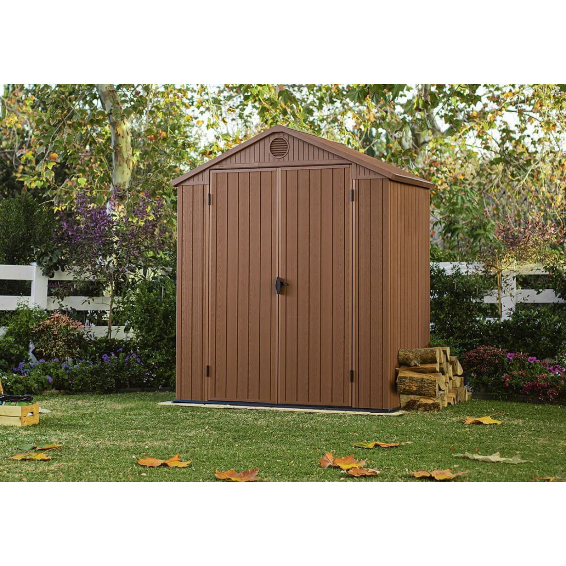The Darwin 6x4 shed is a versatile and sturdy storage unit designed for storing gardening equipment and tools. Made from innovative Evotech+ panels, it offers excellent durability and a natural wood-like appearance. Its construction is weather and UV resistant, so it does not require any additional maintenance. The roof, reinforced with metal elements, is designed to withstand loads of up to 75 kg/m².