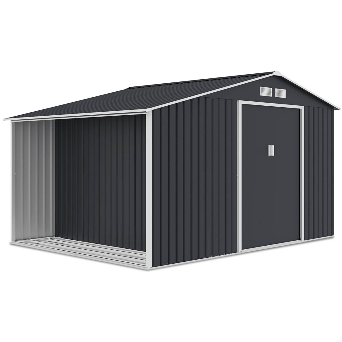 The MADISON tool shed, measuring 342x255 cm, is constructed of high-quality galvanised steel, which guarantees durability and resistance to weather conditions. Equipped with sliding doors for easy access and ventilation holes, the shed provides optimal conditions for storing tools and garden equipment. The woodshed attached to the shed is configurable and can be mounted on either side as needed.