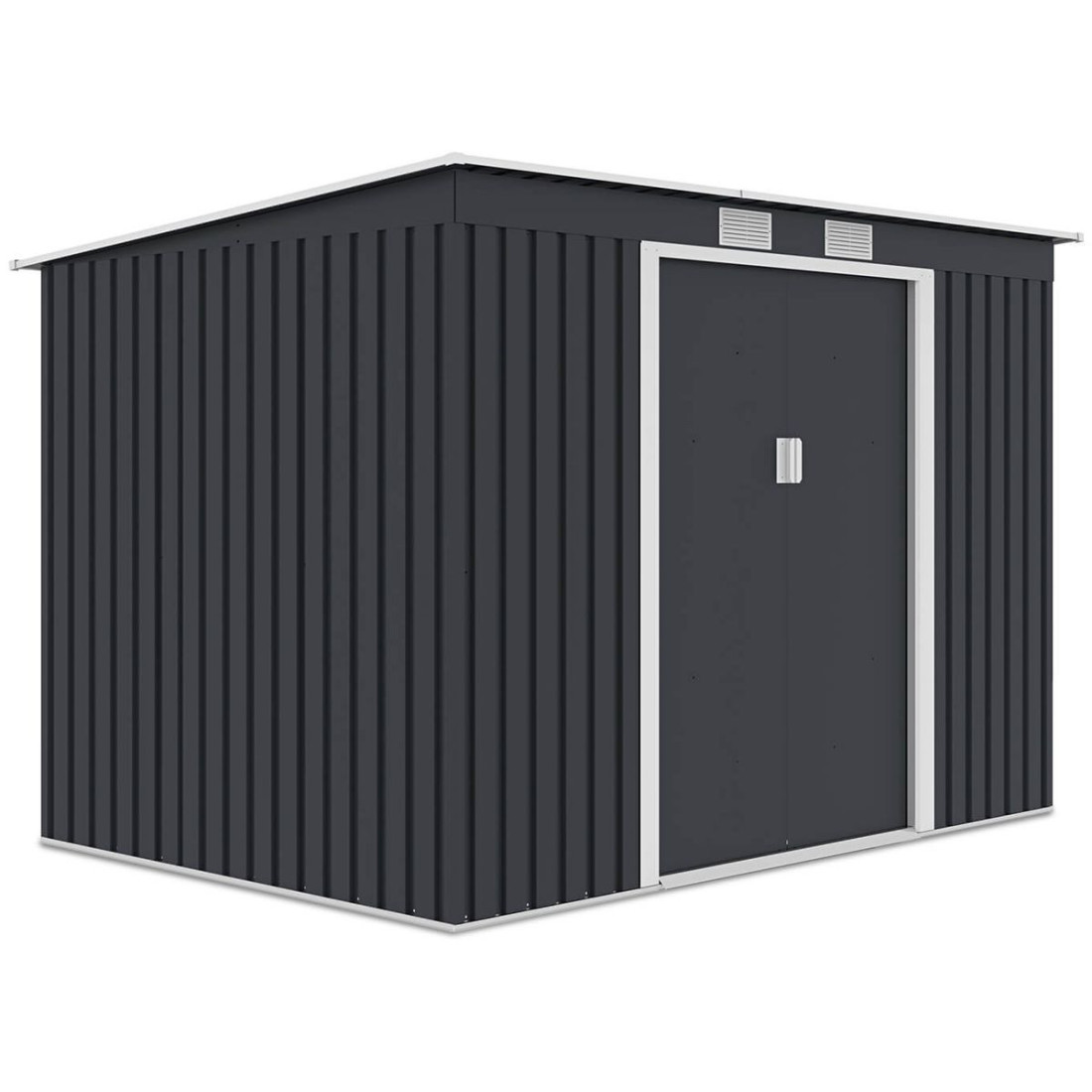 The Hardmaister OREGON tool shed offers durability and functionality thanks to its galvanised steel construction. It features a sliding door for easy access and ventilation holes for optimal air circulation. A lock provides additional security for the interior. The shed has a sloping roof, which protects against water and overload.