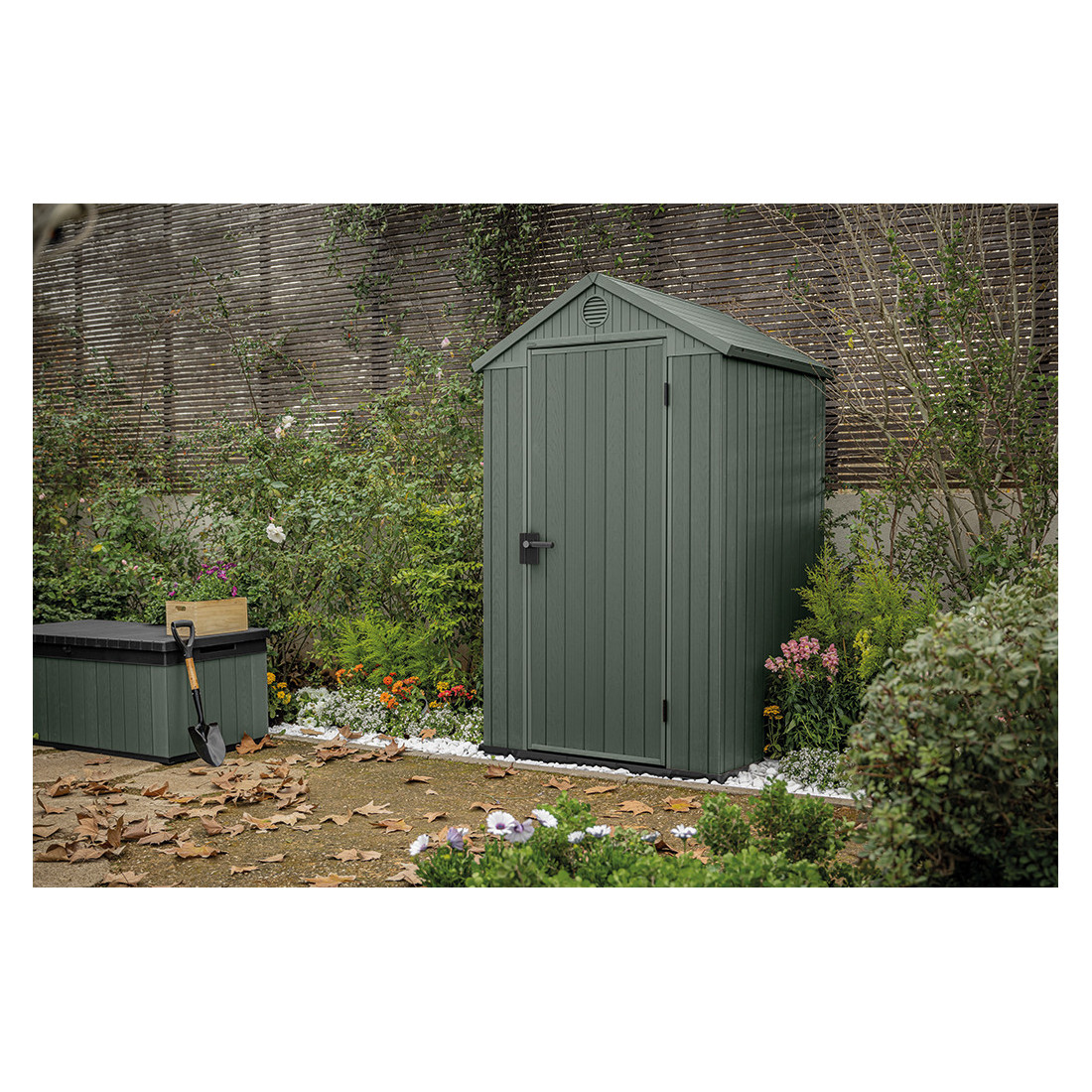 A garden shed made of Evotech+ panels, which combine the aesthetic appeal of wood with the durability of synthetic materials. Its 16 mm thick walls and roof reinforced with metal elements are weather-resistant and do not require additional impregnation. The product is designed for self-assembly thanks to its tongue-and-groove system.