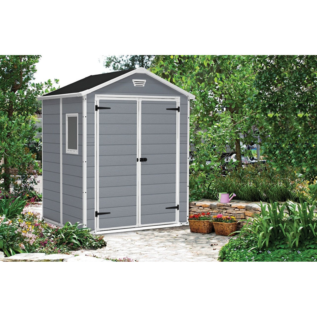 The Keter Manor 6x5DD tool shed is a sturdy structure designed for storing tools and garden equipment. Made of polypropylene with a wood effect, it offers durability and aesthetics without the need for maintenance. It features double doors that can be locked with a padlock, a side window for natural lighting and ventilation holes for air circulation.