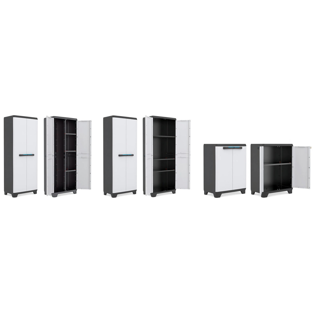 The KETER/KIS LINEAR SET garage cabinet set consists of three units: a tall, functional and low cabinet, each made of durable polypropylene. The tall cabinet has three adjustable shelves with a load capacity of up to 15 kg each, while the functional cabinet is divided into two compartments with adjustable shelves with a load capacity of up to 10 kg. The low cabinet offers a single shelf with a load capacity of up to 15 kg. Ergonomic handles and the option of padlocking ensure secure storage.