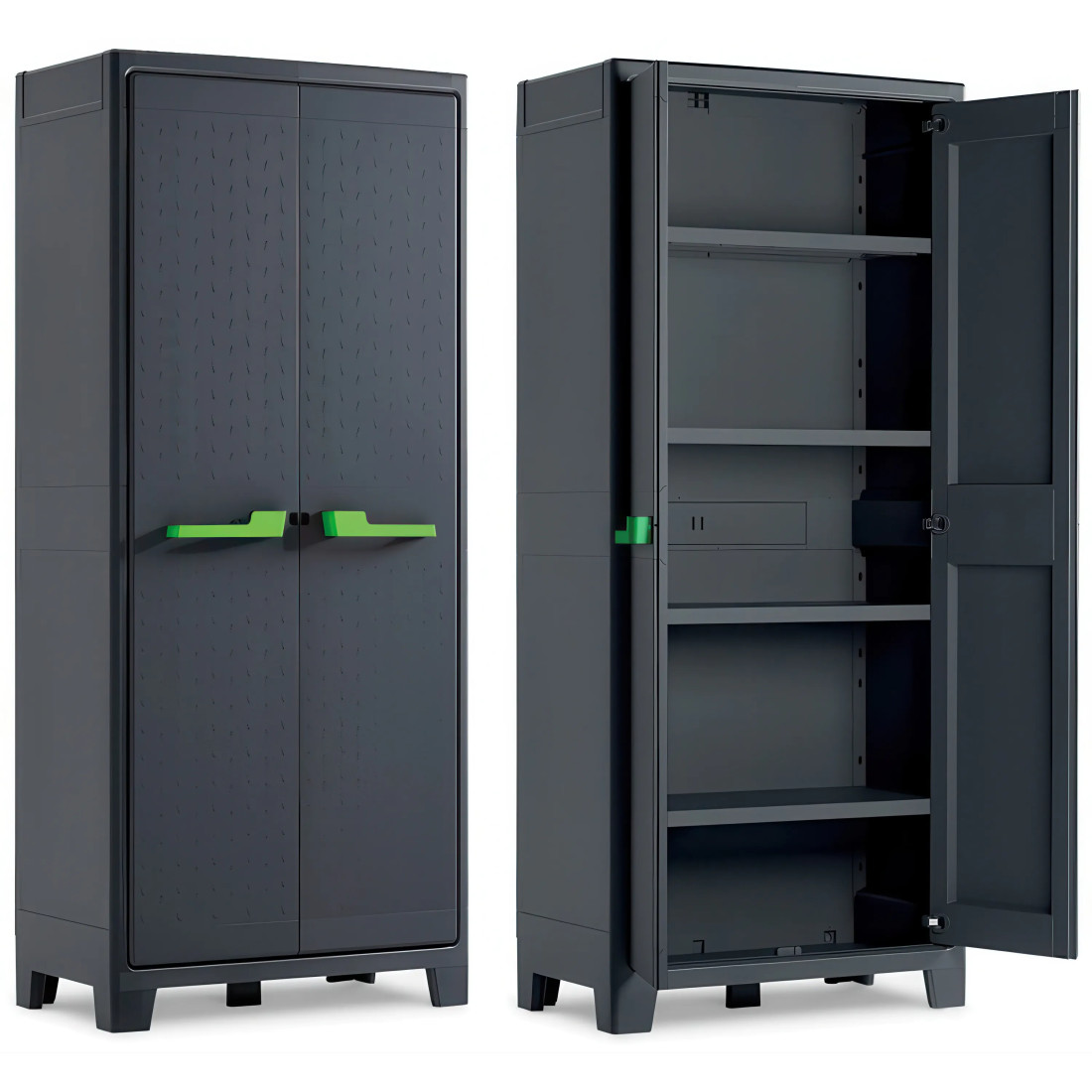 The Moby High Cabinet garden cabinet has been designed for versatility and durability in changing conditions. Made of polypropylene, resistant to weather conditions, it is the perfect solution for places requiring solid storage. This model has four adjustable shelves, each capable of holding up to 30 kg, allowing you to customise the interior to your specific needs. Ergonomic handles and the option of padlocking are additional design advantages.