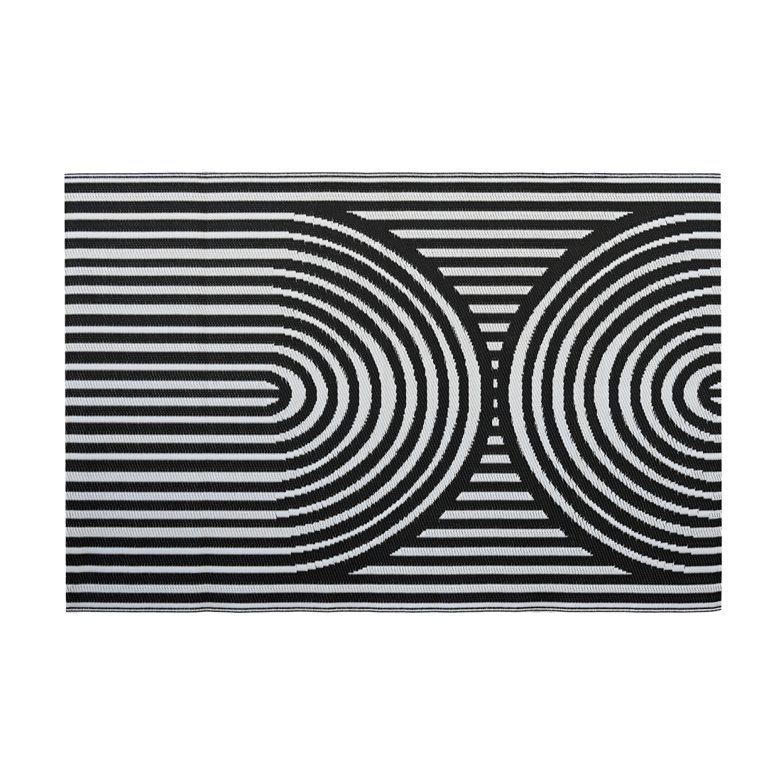 A terrace rug measuring 160x230 cm, made of durable polypropylene. It features a black and white geometric pattern and is weather and water resistant. Ideal for outdoor as well as indoor use. The product is easy to clean and resistant to abrasion, making it a durable and functional solution for various spaces.