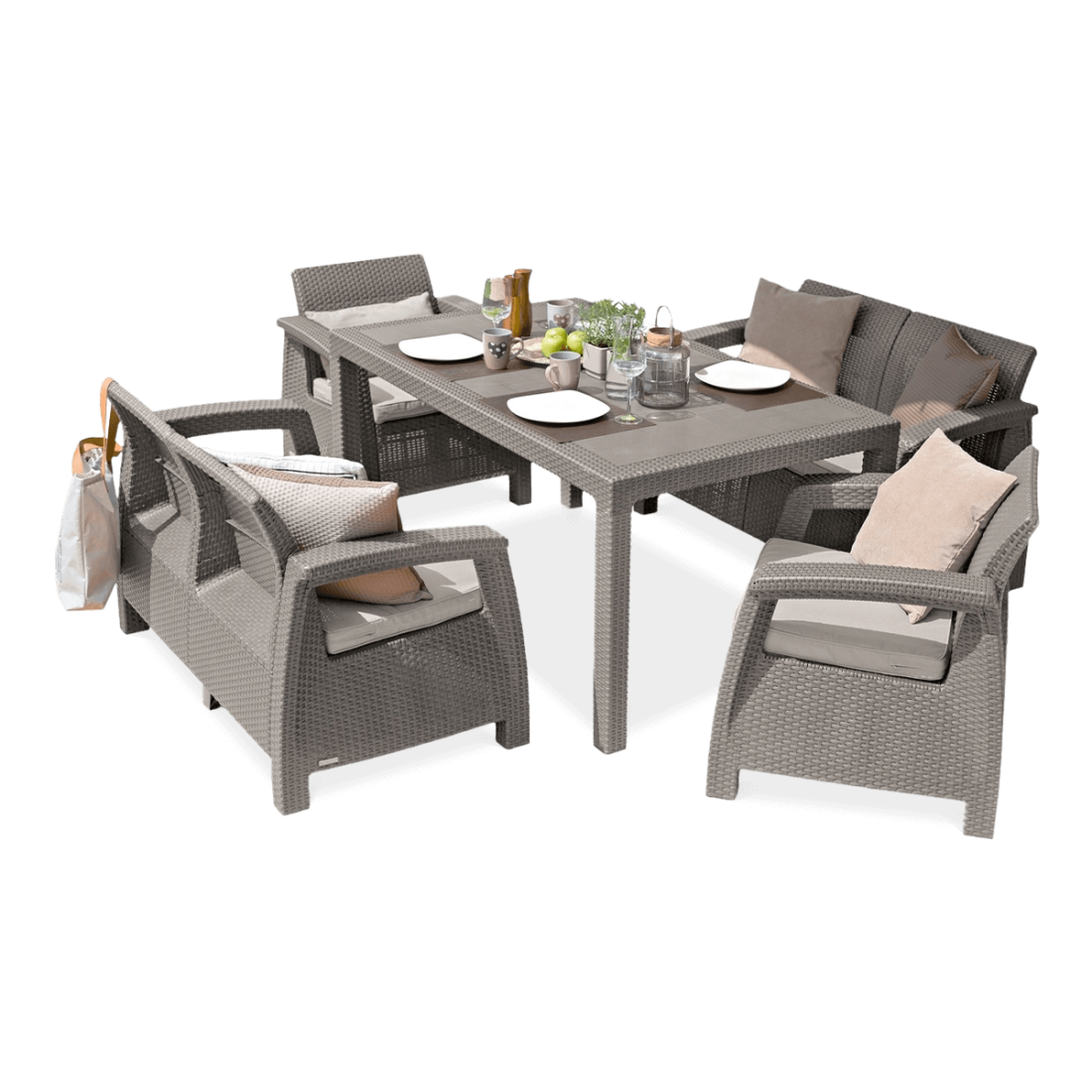 A 5-piece furniture set made of polypropylene, consisting of a large table, two armchairs and two two-seater sofas. It ensures durability and resistance to weather conditions and UV radiation. The furniture is easy to assemble, and its design refers to the aesthetics of technorattan.