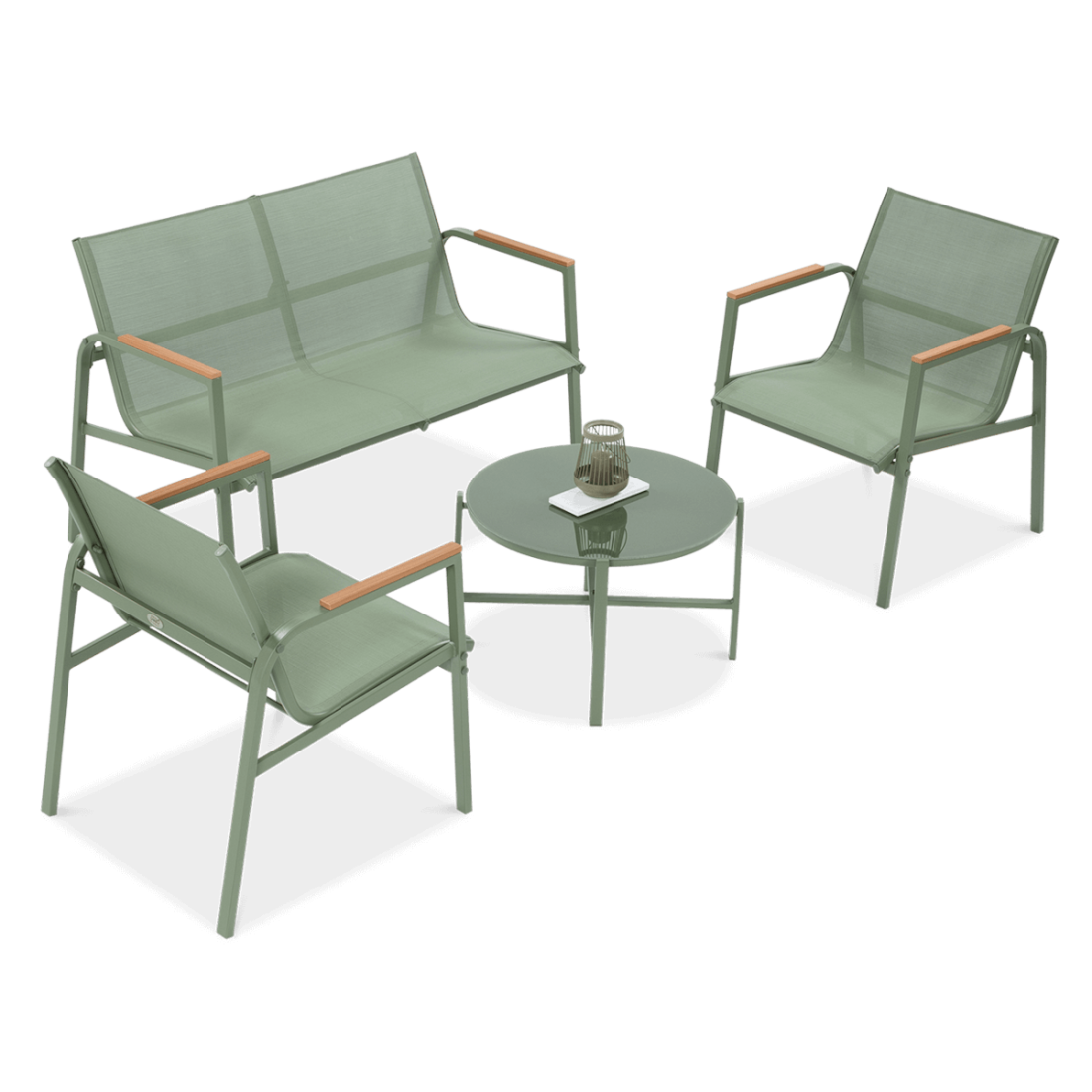 The MANGO CAFFE Green set features a solid construction made of galvanised steel, which ensures its durability and resistance to various weather conditions. The set includes a two-seater sofa, two armchairs and a coffee table. The table top is covered with 5 mm thick tempered glass, which guarantees its longevity and ease of cleaning. The decorative polywood finish on the armrests gives the whole set an elegant look.