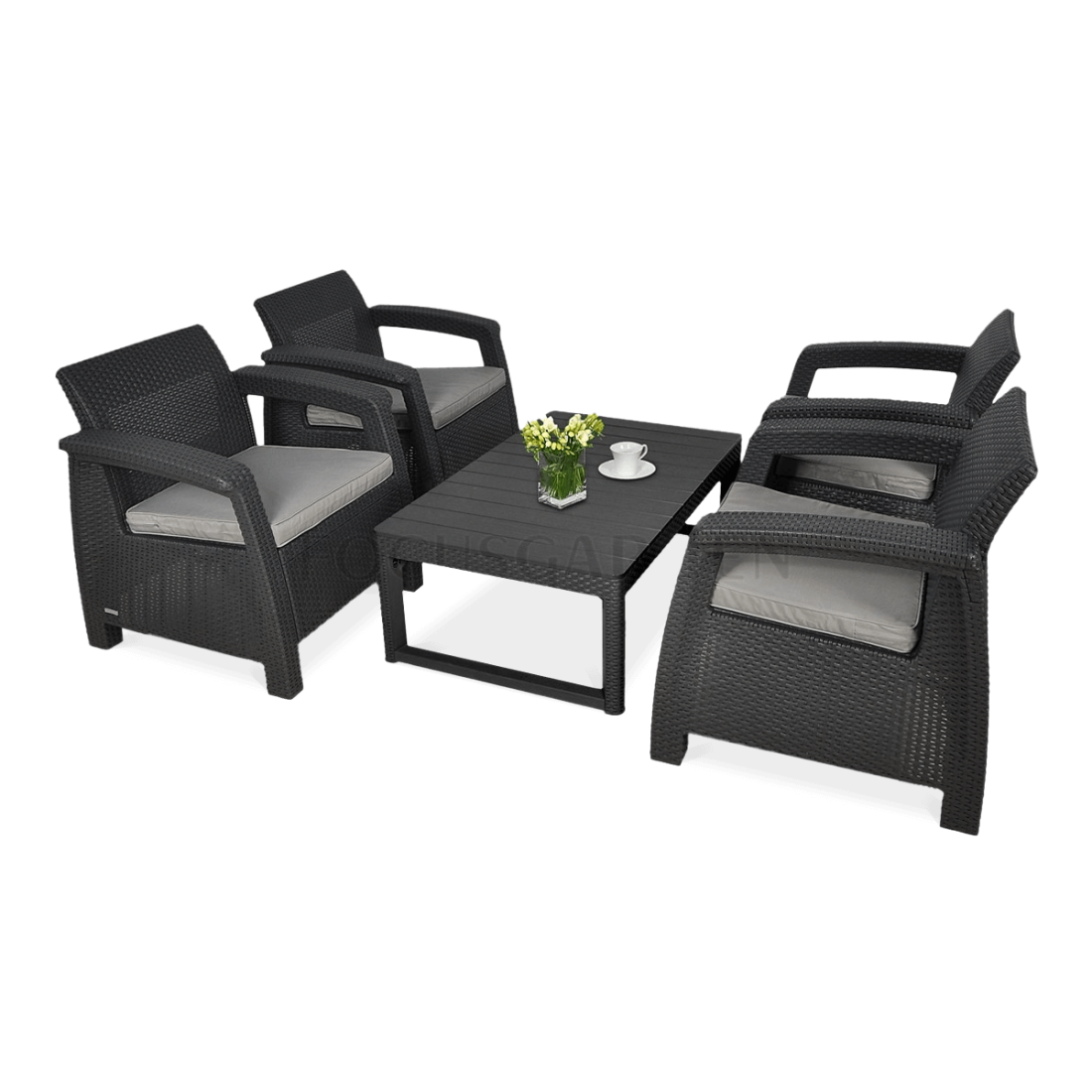 The CORFU QUATTRO/LYON furniture set consists of four armchairs and an adjustable table, made of polypropylene with a rattan texture, which makes it resistant to UV radiation and weather conditions. The product comes with cushions that ensure comfortable seating.