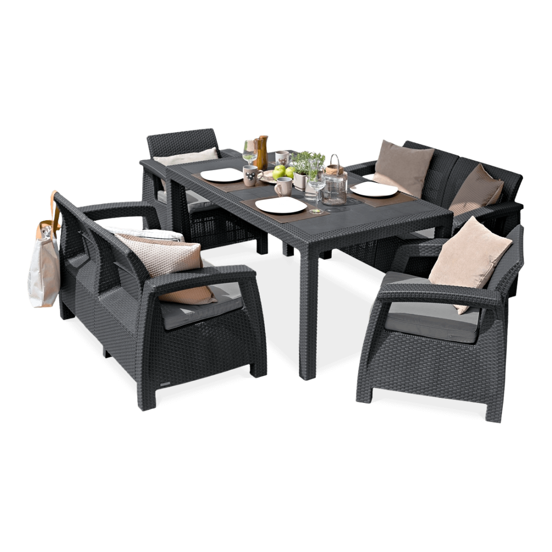 The 5-piece garden furniture set consists of a large table, two armchairs and two two-seater sofas. The furniture is made of durable polypropylene and features an elegant graphite colour. The design allows for both indoor and outdoor use without worrying about weather conditions. The table is equipped with a parasol hole, and the set includes seat cushions.