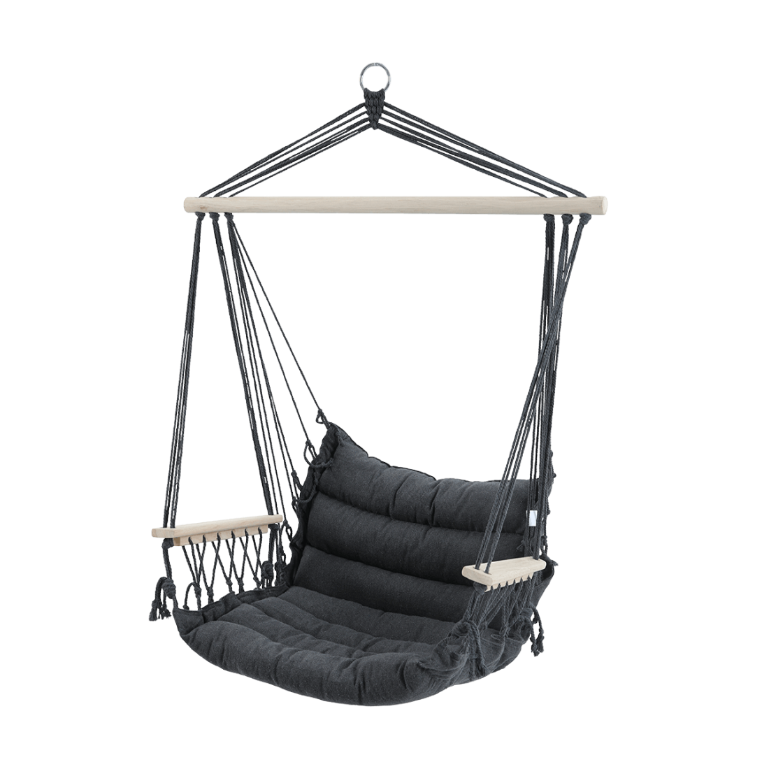The BARBADOS Dark Grey hanging chair has been designed with ergonomics and durability in mind, made from a sturdy 90 cm long wooden bar. The polycotton seat with spray filling ensures comfort, while the wooden armrests add functionality and aesthetics. The product has a maximum load capacity of 100 kg, ensuring safe use in various garden spaces.