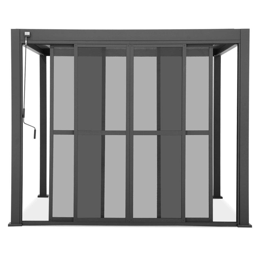 High-durability polycarbonate sliding doors measuring 279 cm x 236.5 cm, perfectly suited to pergolas with a 3 m wall. The stable powder-coated aluminium frame guarantees resistance to changing weather conditions and long-term reliability. The product is easy to use and maintenance-free, saving your organisation valuable time.
