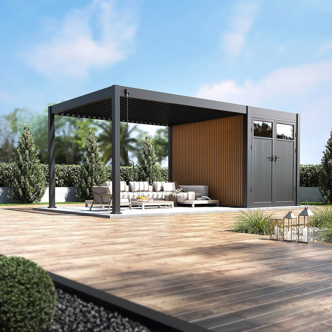 The FUSION 3x4+2 Terrace Pergola from Gutroof is an advanced solution for increasing the functionality of outdoor spaces. It features a corrosion-resistant aluminium structure that is resistant to adverse weather conditions, as well as a durable Akzo Nobel coating. Thanks to adjustable roof slats, the user can control the level of sunlight and protection from precipitation. The integrated water drainage system eliminates the problem of standing water, supporting the longevity of the structure. A large built-in storage compartment provides space for tools or seasonal equipment, while double doors with security features and a Polyglass window ensure easy access and an attractive appearance.