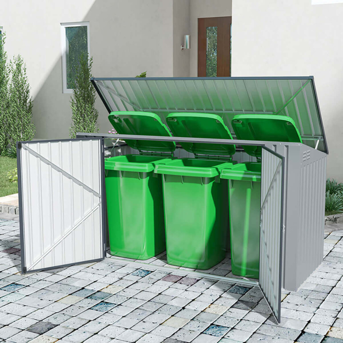 The Davis 8x3 Light Grey enclosure is a sturdy structure designed to organise and keep outdoor spaces tidy. Made of durable galvanised steel, it is weather-resistant and provides solid protection for three waste bins. The stable structure, integrated with front doors and a hinged lid, guarantees easy access to the bins, while pneumatic springs ensure convenient use.