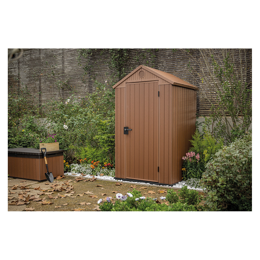 Domek ogrodowy wykonany z solidnego kompozytu Evotech+ dostępny w modelu Darwin 4x4. Dzięki panelom imitującym drewno produkt nie wymaga konserwacji, co zapewnia jego trwałość i estetykę przez wiele lat. Wyposażony w metalowe wsporniki oraz zintegrowane kratki wentylacyjne gwarantujące odpowiednią cyrkulację powietrza. Ponadto dach wytrzymuje obciążenia do 75 kg/m², co czyni ten produkt odpornym na trudne warunki atmosferyczne.