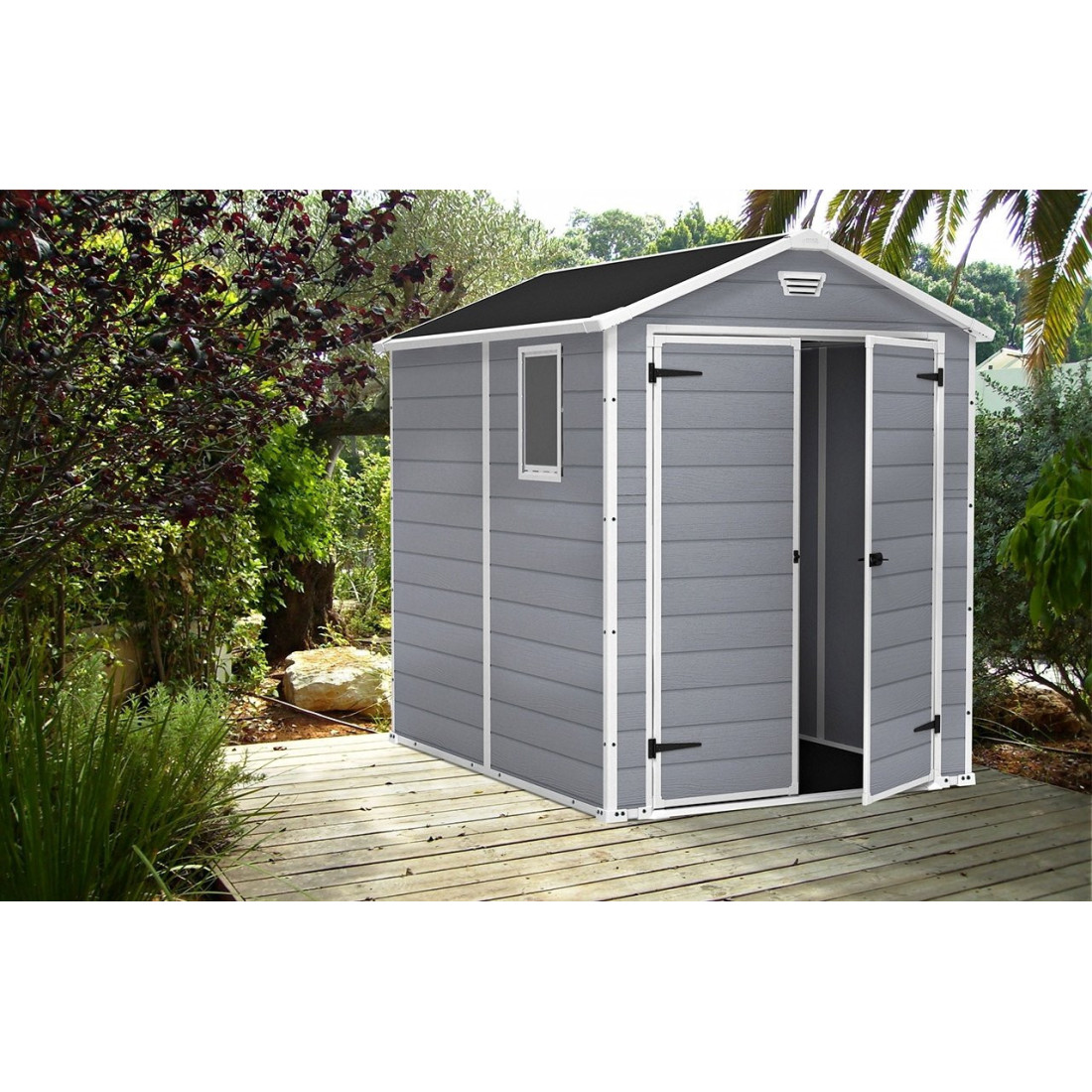 Keter Manor 6x8DD to wszechstronny domek ogrodowy, wykonany z trwałego tworzywa sztucznego o estetyce drewna. Zaprojektowany z myślą o minimalnej potrzebie konserwacji, posiada solidne dwuskrzydłowe drzwi z możliwością zabezpieczenia, wbudowane systemy wentylacyjne i odporność na warunki atmosferyczne.
