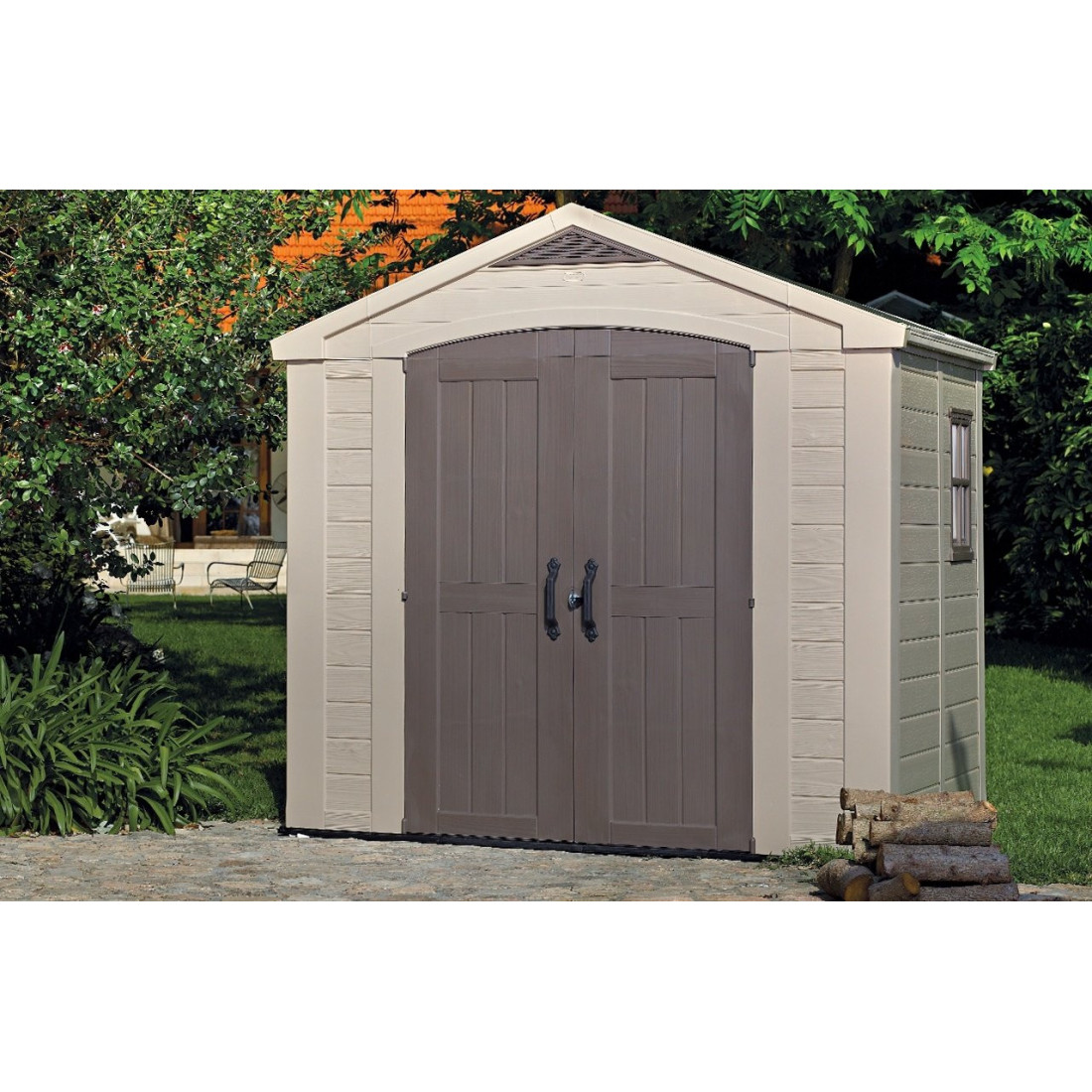 Keter Factor 8x6 to wytrzymały domek narzędziowy, stworzony z myślą o efektywnym przechowywaniu narzędzi i wyposażenia ogrodowego. Charakteryzuje się konstrukcją z tworzywa sztucznego o strukturze drewna, co zapewnia odporność na warunki atmosferyczne i promieniowanie UV. Niezależnie od pogody, domek pozostaje stabilny dzięki wzmocnionym panelom oraz dwuspadowemu dachowi. Jego wnętrze jest jasne dzięki oknu i doświetleniu dachowemu, co poprawia widoczność i organizację powierzchni użytkowej.