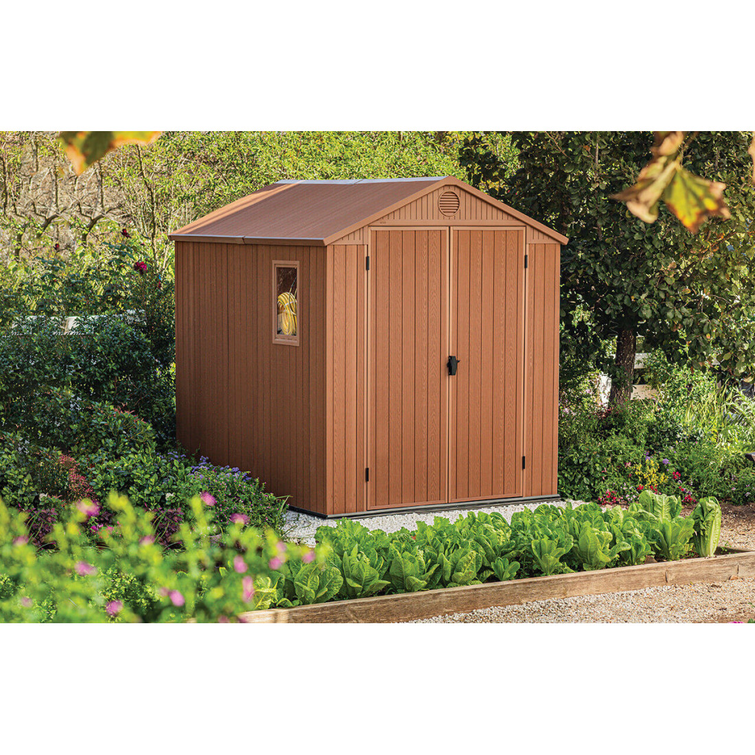 Domek ogrodowy Darwin 6x8 z paneli kompozytowych Evotech+ zapewnia niezawodną strukturę magazynową dla narzędzi i sprzętu ogrodowego. Jego konstrukcja o grubości 16 mm zapewnia odporność na warunki atmosferyczne, a system pióro-wpust ułatwia montaż. Metalowe wzmocnienia dachu podnoszą jego wytrzymałość, natomiast wbudowany system wentylacyjny i okno zapewniają odpowiednią cyrkulację powietrza i oświetlenie wnętrza.