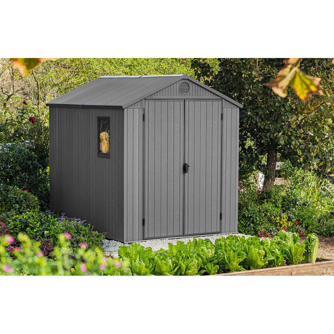Domek ogrodowy Darwin 6x8 to przestronny obiekt magazynowy z paneli kompozytowych Evotech+, które są odporne na niekorzystne warunki atmosferyczne. Odznacza się wysoką wytrzymałością dzięki wzmocnionej metalowymi elementami konstrukcji dachu i możliwości montażu drzwi z zabezpieczeniem na kłódkę. Dzięki dwuskrzydłowym drzwiom, dostarczonym w zestawie, oferuje łatwy dostęp, a wbudowane okno i system wentylacji zapewniają doskonałe warunki wewnętrzne.