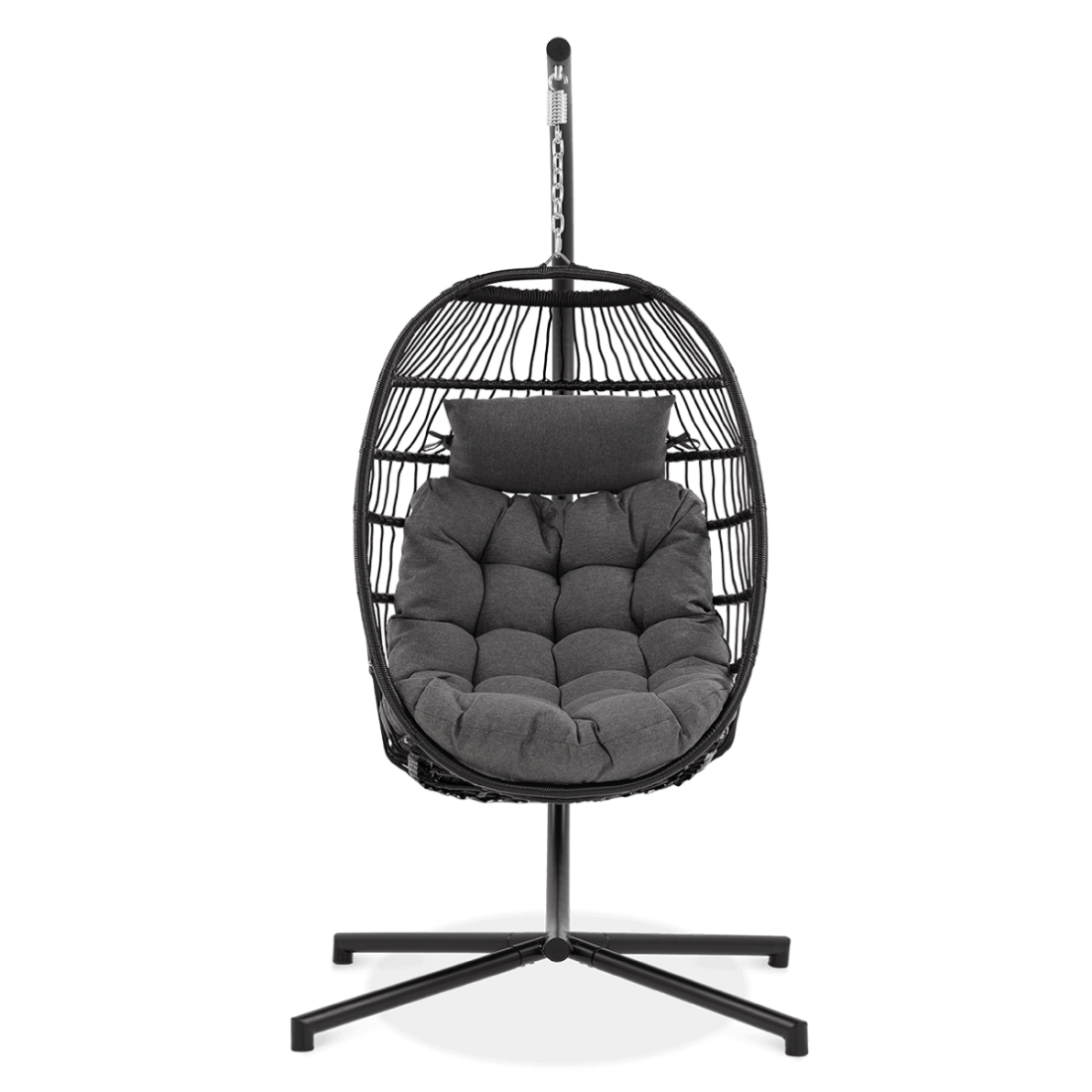 Wiszący fotel kokonowy Harmony Black oferuje solidną konstrukcję ze stali pokrytej farbą proszkową oraz trwały kosz z technorattanu. Wyposażony w ergonomiczne poduszki i zagłówek, fotel zapewnia komfort oraz wsparcie dla ciała. Dzięki możliwości płaskiego składania kosza, produkt jest łatwy w przechowywaniu.