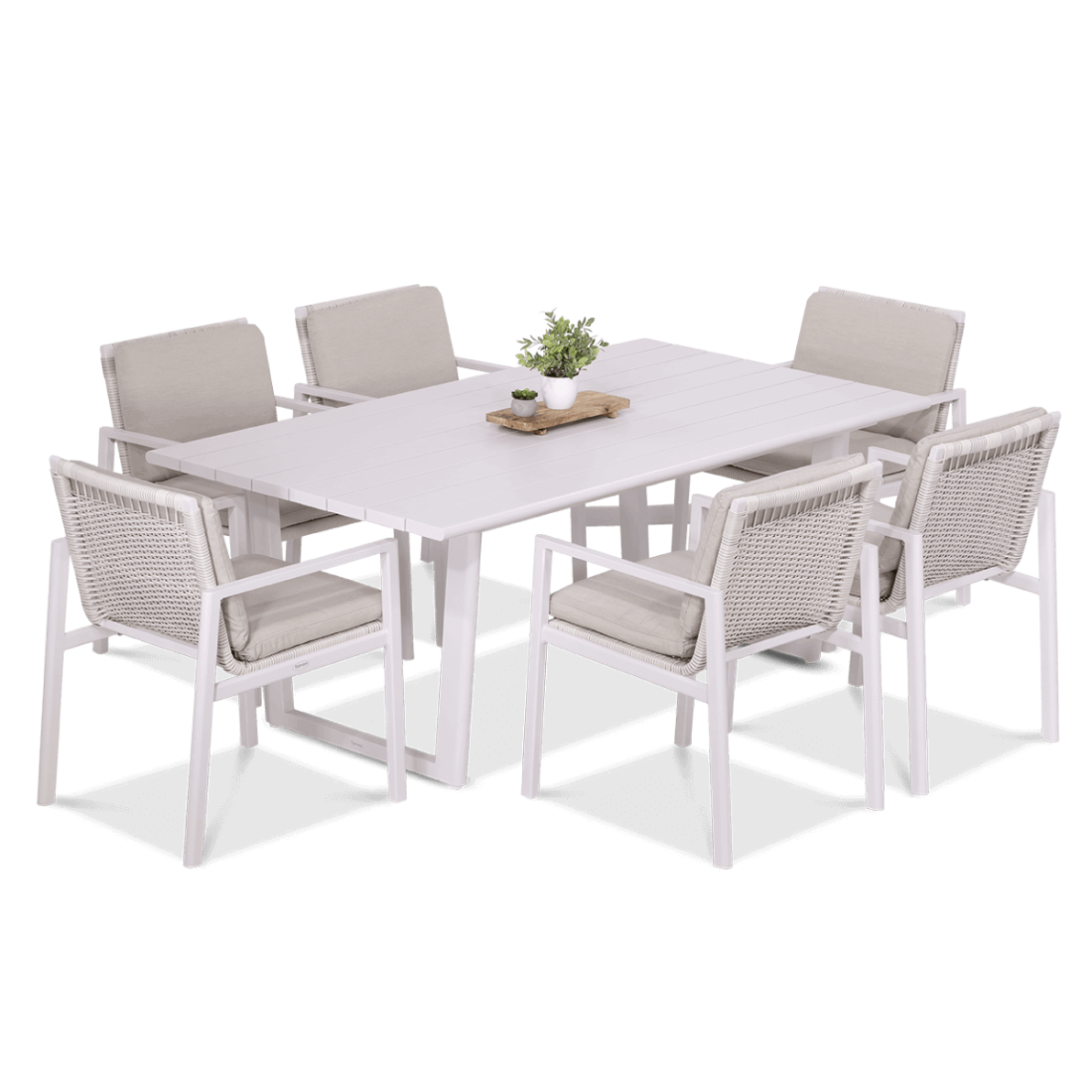 Zestaw jadalniany Lotus Dining 61 White Furrore został zaprojektowany z myślą o elegancji i funkcjonalności. Składa się z solidnego stołu oraz 6 wygodnych krzeseł, które doskonale nadają się do użytku zarówno wewnątrz, jak i na zewnątrz pomieszczeń. Stożkowate nogi stołu zapewniają stabilność, a jego minimalistyczny design sprawia, że pasuje do różnorodnych aranżacji.