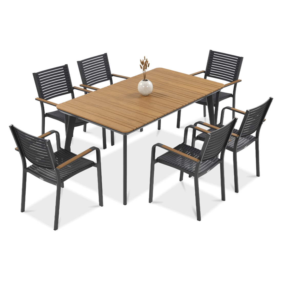 Zestaw jadalniany Tacoma Graphite sklada sie ze stołu i sześciu krzeseł, wykonanych z tworzywa imitujacego strukturę naturalnego rattanu. Komponenty sa odporne na warunki atmosferyczne, w tym wilgoć, promieniowanie UV oraz zmiany temperatury. Stół wyposażony jest w gladki blat ułatwiający utrzymanie czystości, a wygodne krzesła dostosowane zostały do intensywnego użytkowania w przestrzeniach komercyjnych. Calość utrzymana w jednolitej kolorystyce graphite podnosi estetyke i spójność aranżacji.