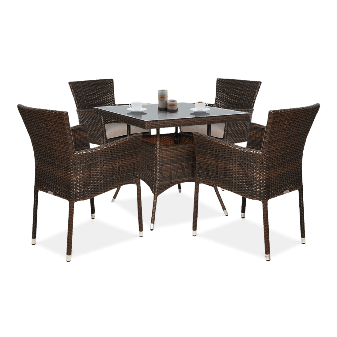 Zestaw mebli ogrodowych z technorattanu Leridalugo 4+1 Brown to doskonały wybór dla firm projektowych, hurtowników i punktów sprzedaży poszukujących eleganckich i trwałych mebli do przestrzeni zewnętrznych. Składający się z 4 krzeseł i stołu z blatem szklanym zestaw doskonale wpasowuje się w różnorodne aranżacje ogrodów, tarasów i restauracji.
