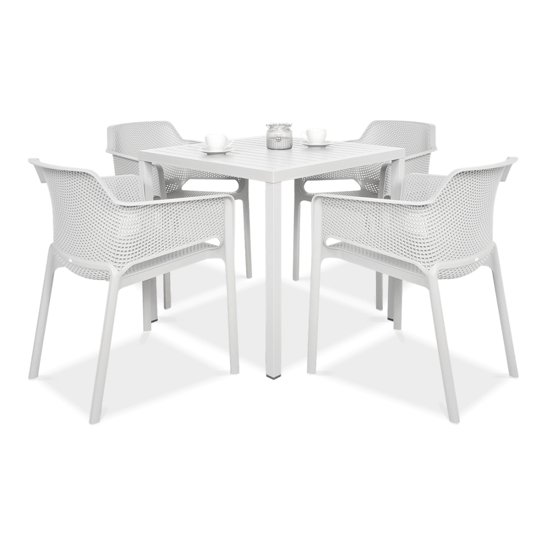 Zestaw mebli Nardi NET + CUBE 80/41 Bianco to komplet mebli z segmentu premium, przeznaczony do intensywnej eksploatacji w sektorze komercyjnym. W skład kompletu wchodzą cztery krzesła siatkowe NET oraz stabilny, kwadratowy stół CUBE o wymiarach 80 x 80 cm. Elementy wykonano z wysokiej jakości polipropylenu barwionego w masie, odpornego na warunki atmosferyczne i promieniowanie UV. Meble wyposażone są w antypoślizgowe stopki i otwory odpływowe, co usprawnia konserwację i użytkowanie w przestrzeni zewnętrznej przez cały sezon.