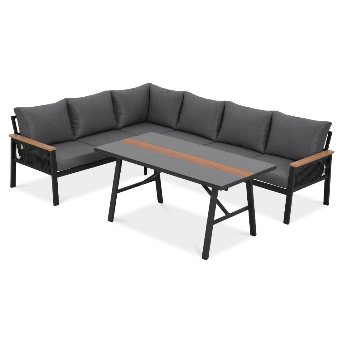 Naroznik ogrodowy Ascona Dinning Dark Grey stanowi nowoczesne rozwiazanie dla stref relaksu i jadalnianych na zewnatrz. Komplet obejmuje przestronny modul narozny, dwa fotele oraz stol z wygodnym, laminowanym blatem. Konstrukcja opiera sie na wytrzymalym aluminium malowanym proszkowo, odpornym na zmienne warunki atmosferyczne. Elementy siedzisk pokryte sa trwala tkanina, a dodatkowe poduszki zapewniaja komfort uzytkowania i latwosc czyszczenia.