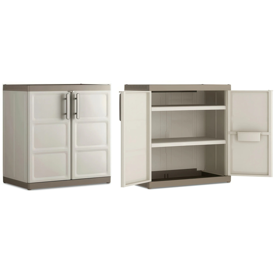 Keter Kis EXCELLENCE XL LOW CABINET to wytrzymałe rozwiązanie przechowywania stworzone z myślą o efektywnej organizacji przestrzeni. Szafka oferuje solidną konstrukcję z polipropylenu, odpornego na negatywne warunki atmosferyczne. Wyposażona w dwie regulowane półki, z każdą zdolną udźwignąć do 25 kg, gwarantuje elastyczność w organizacji ciężkich przedmiotów. Ergonomiczne uchwyty na drzwiczkach umożliwiają łatwy dostęp, a możliwość zamknięcia na kłódkę zapewnia dodatkowe bezpieczeństwo.