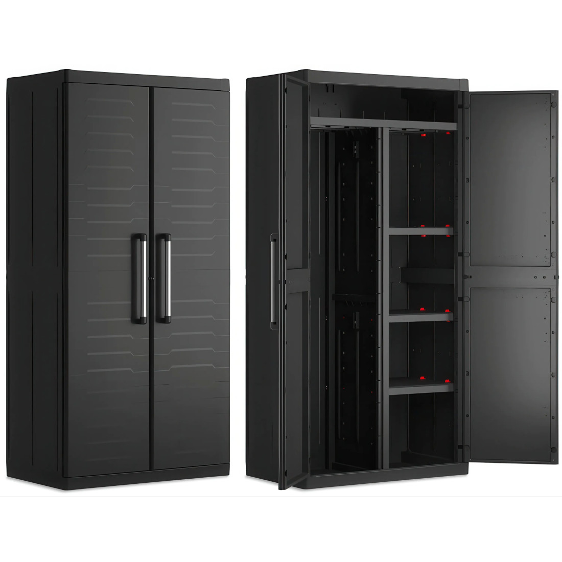 Szafa wielofunkcyjna DETROIT XL jest solidnym rozwiązaniem stworzonym z wytrzymałego polipropylenu, co zapewnia odporność na uszkodzenia oraz długotrwałe użytkowanie. Wyposażona w cztery regulowane półki, każda o nośności 25 kg, oferuje możliwość elastycznego dostosowania wnętrza do różnorodnych potrzeb przechowywania. Ergonomiczne aluminiowe uchwyty ułatwiają obsługę drzwi, które można dodatkowo zabezpieczyć kłódką.